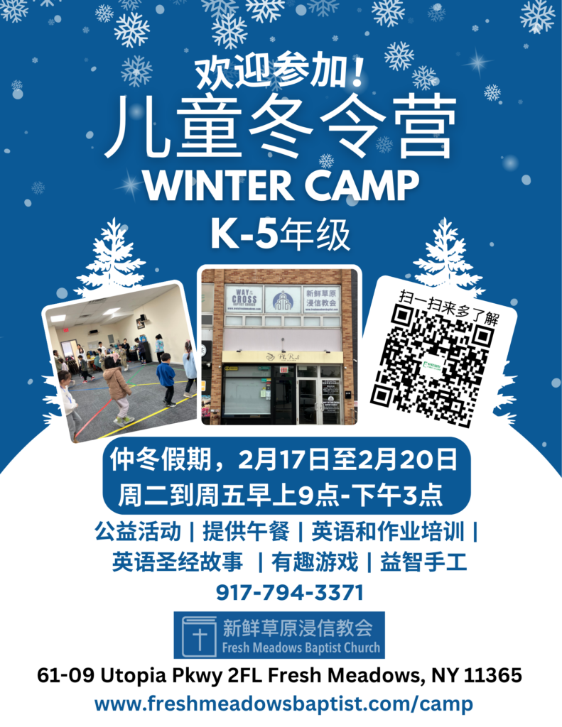 儿童冬令营时间为: 2025年仲冬假期2月17日-2月20日 周二到周五早上9点-下午3点 2月16日周一是美国总统日,也是中国除夕:那天不开冬令营 2月17日周二是大年初一: 那天开冬令营,但是如果有其他的安排可以选择那一天孩子们不参加 K年级-5年级的孩子们可以参加 儿童冬令营活动计划包含: 仲冬假期作业培训 英语读写练习 英语圣经故事 有趣游戏 益智手工 公益活动 提供午餐 完全免费的冬令营,如果你想帮助支付费用可以自愿奉献 30位额满为止 在下面的表格可以报名 请在浏览器中启用JavaScript来完成此表单。家长名字 Parent Name *孩子的名字 Child‘s Name *孩子是哪一年级?What is your child's grade? *K年级 (Kindergarten)1年级 1st Grade2年级 2nd Grade3年级 3rd Grade4年级 4th Grade5年级 5th Grade孩子的T恤大小 Child Tshirt Size *Youth XS (Extra Small)Youth S (Small)Youth M (Medium)Youth L (Large)Youth XL (Extra LargeAdult S (Small)我不知道 I don’t know phone Tshirt Name 你的电话号码是什么? What is your phone number? *你的地址是什么?What is your address? *你的孩子有没有食物过敏 Does your child have any food allergies? *冬令营的第一天 (周二) 是春节,你的孩子打算那一天参加吗?Does your child plan to attend CNY? *周二到周五都参加 Attend Tuesday-Friday只参加周三到周五 Only Attend Wednesday-Friday你允许你的孩子参加新鲜草原浸信教会的冬令营吗? Do you allow your child to participate in Fresh Meadows Baptist Church's Winter Camp? *允许 Yes不允许 No提交 Submit 分享到: 点击分享到 Facebook (在新窗口中打开) Facebook 点击以分享到 X(在新窗口中打开) X
